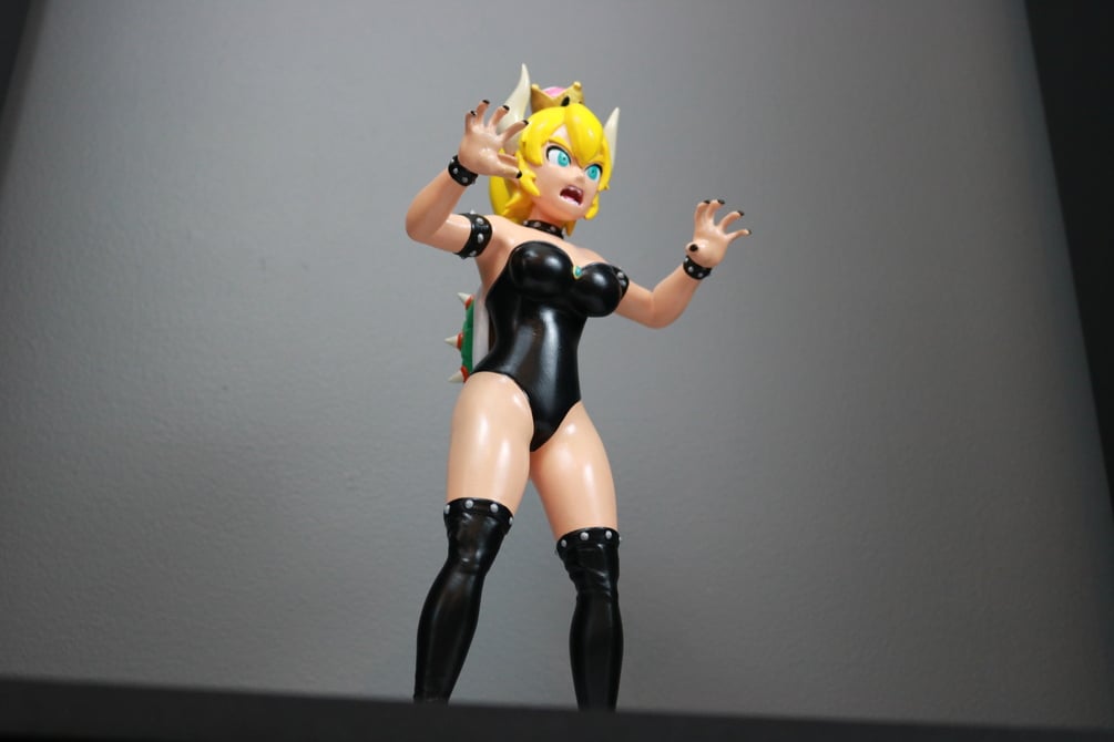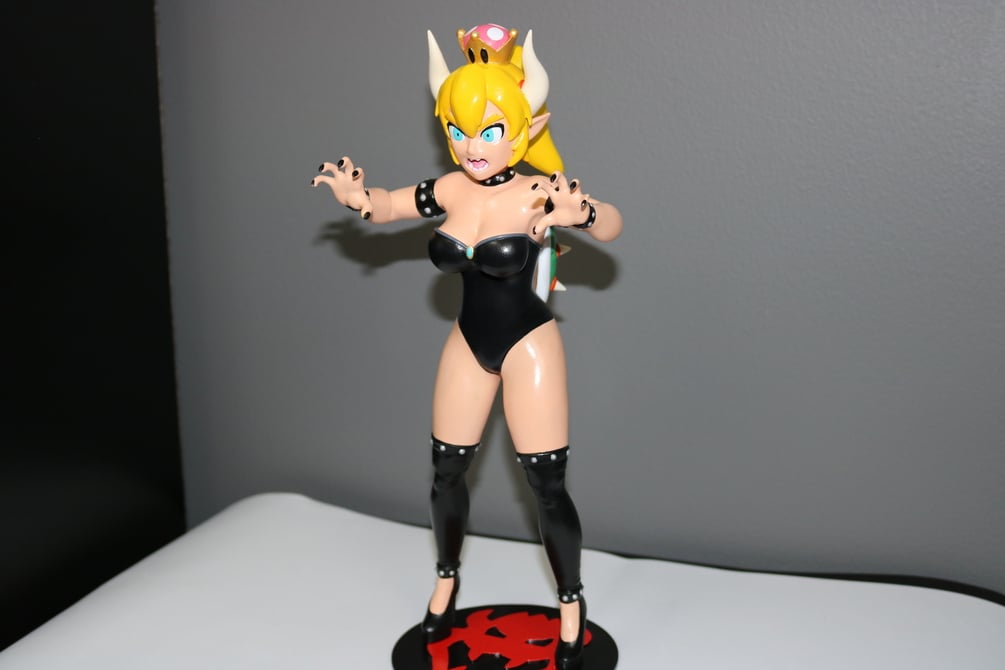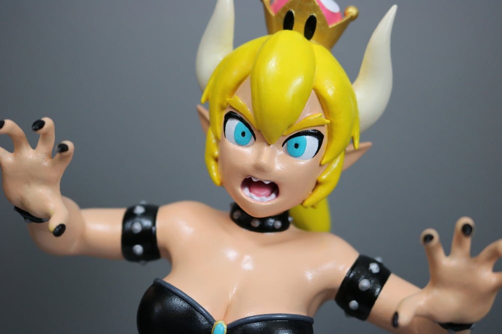 3D printable Bowsette STL, includes versions with and without a dress. Also includes full model files and files split for separate piece resin printing.